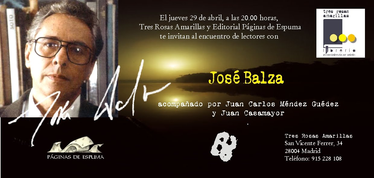 os invitamos al encuentro con lectores de José Balza que tendrá lugar el jueves 29 de abril (20 horas) en la librería Tres Rosas Amarillas (c/San Vicente Ferrer 34). Le acompañará Juan Carlos Méndez Guédez¡Os esperamos!