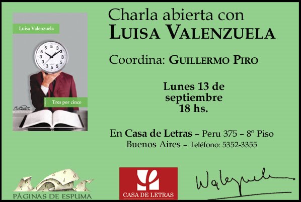 el próximo 13 de septiembre a las 18 horas, Luisa Valenzuzuela conversará con Guillermo Piro sobre su nuevo libros de cuentos Tres por cinco.y muchas cosas más. ¿Dónde? En Casa de Letras (Perú 375 , 6ª planta) No os lo perdáis.