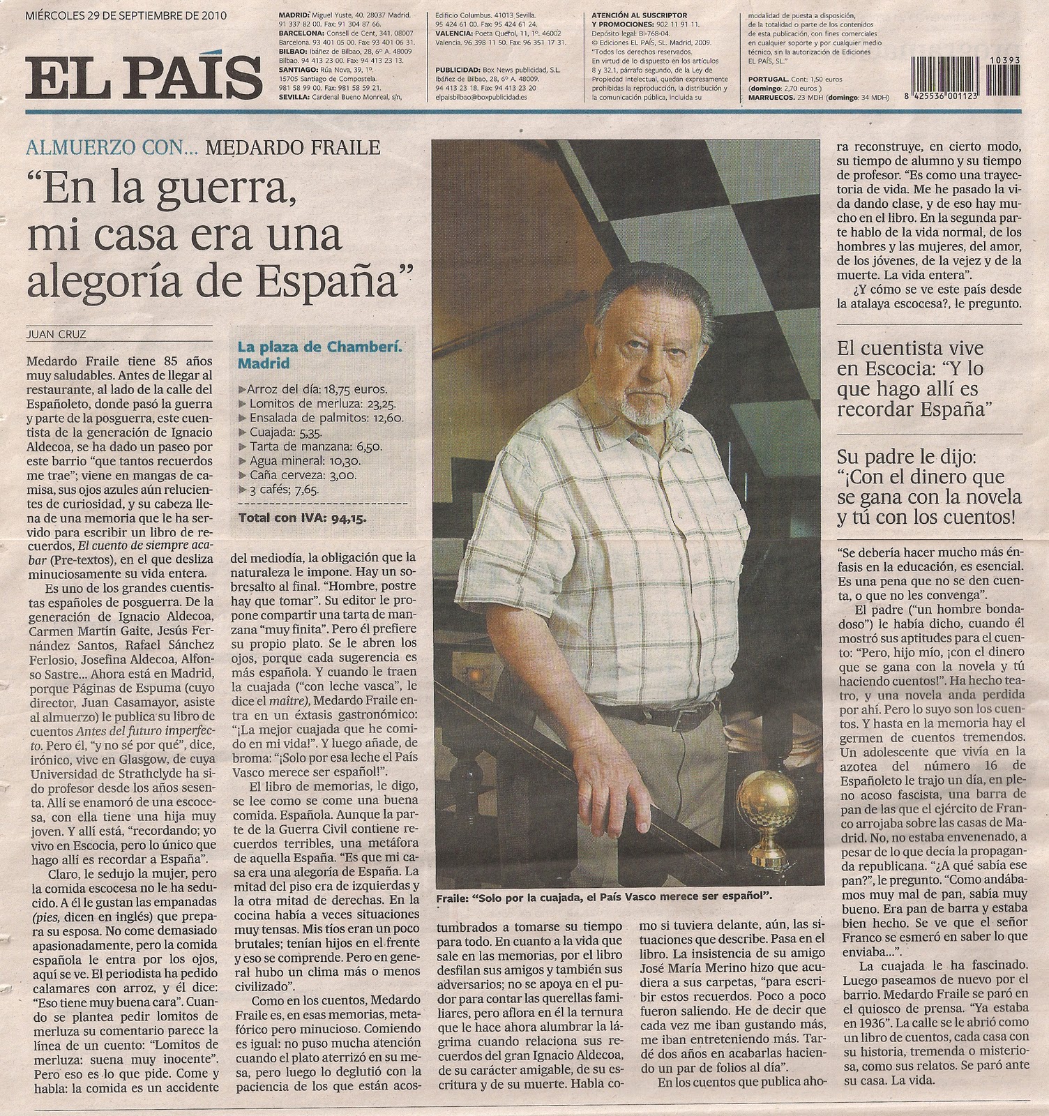 El pasado miércoles 29 de septiembre El Páis dedicó su contracubierta a Medardo Fraile, que fue entrevistado por Juan Cruz: