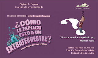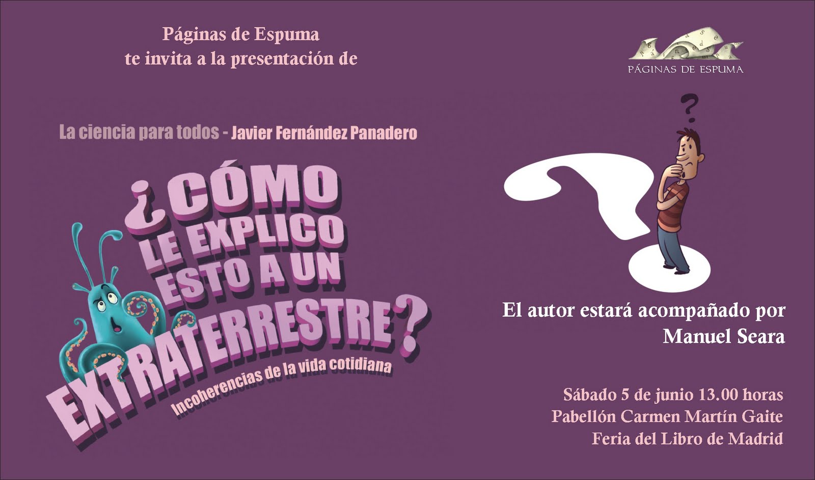 si queréis sentiros un poco extraterrestres y pasar un buen rato, no es perdáis la presentación del libro ¿Cómo le explico esto a un extraterrestre?, de Javier Fernández Panadero. Estará acompañado de Manuel Seara, presentador del programa de RNE A hombros de gigantes. ¡Os esperamos!