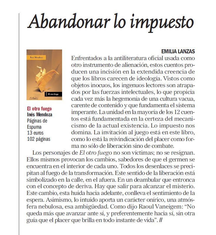 Reseñas de El otro fuego, de Inéss Mendoza. En Diagonal aparece una que firma Emilia Lazas.