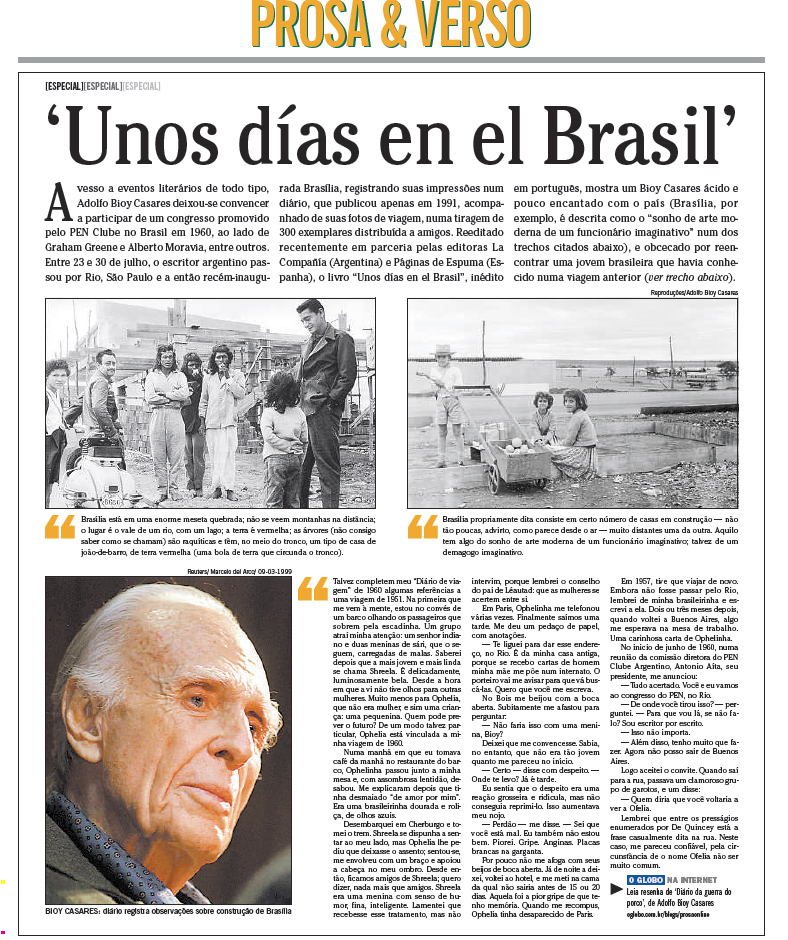 O Globo de Brasil publica un artículo sobre Unos días en el Brasil (Diario de Viaje) de Adolfo Bioy Casares. Os reproducimos la página: